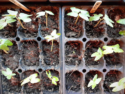 The morning glories have grown a lot just after I moved them closer to the heater in the kitchen.