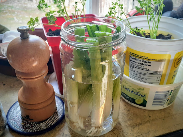 You can compost the ends of your spring onions, but it’s nice to have them growing in the kitchen and because you can use them when cooking.