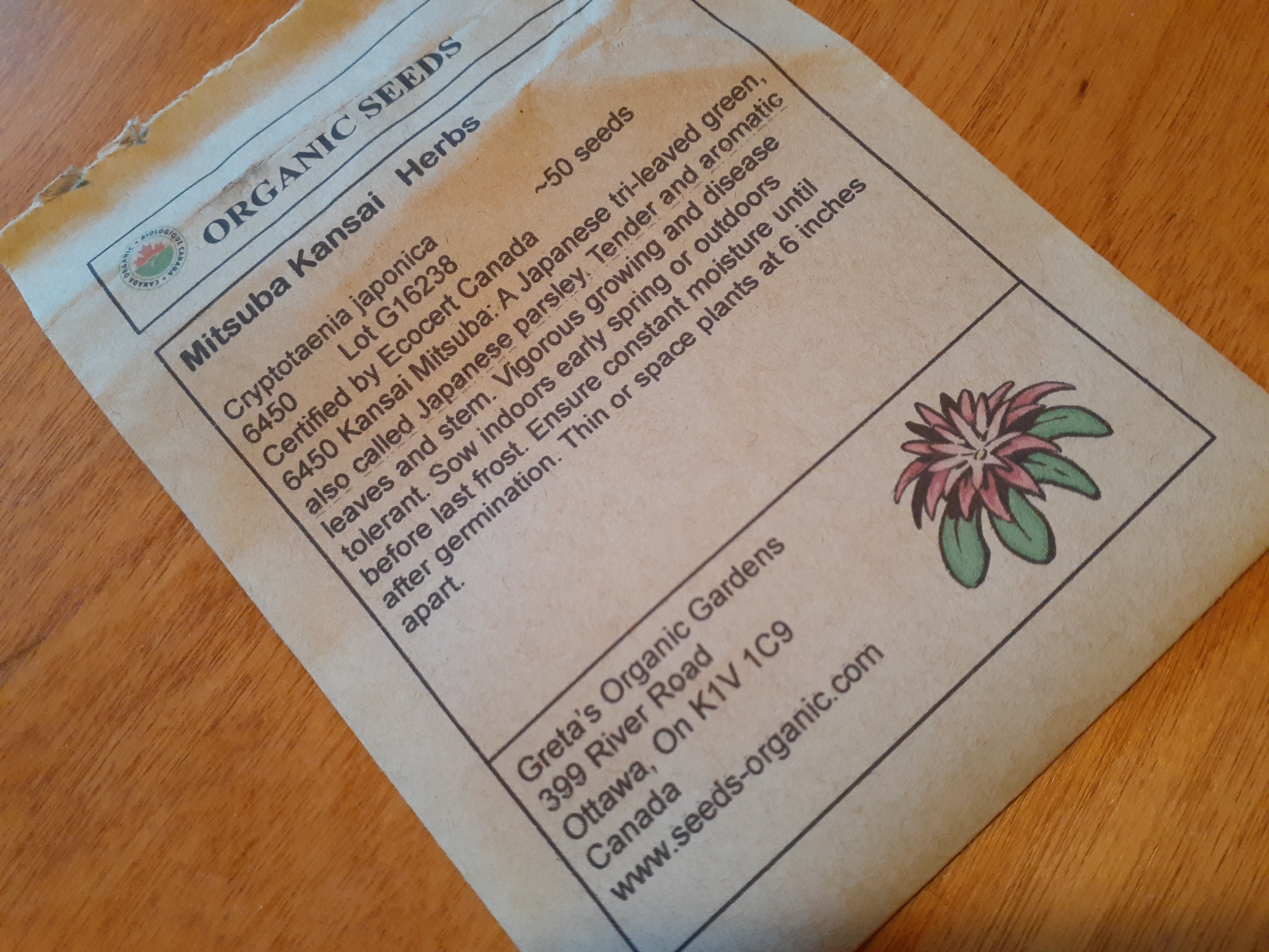 Mitsuba is a Japanese vegetable which we often put in Miso soup. It has a refreshing aroma and crisp stems. I have never seen them in supermarkets here in Canada, but we found Mitsuba seeds online, so we bought them.