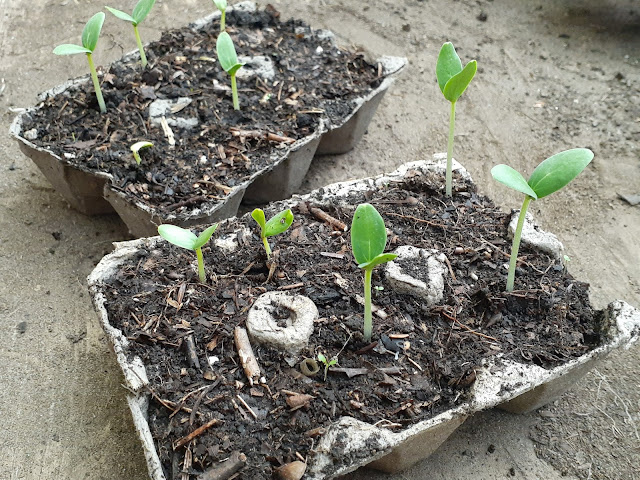 Sowing in the egg cartons works very well. We just need to put them up as soon as they germinate because the soil in the egg cartons is not deep enough for them to grow roots. So I potted them up immediately.