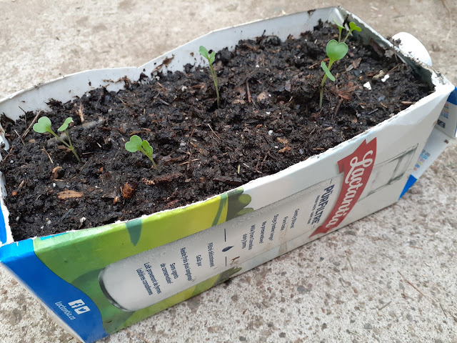 If you need a horizontally rectangular planter you can use a milk carton. Here we have the 2 litre size, which is big enough for this.