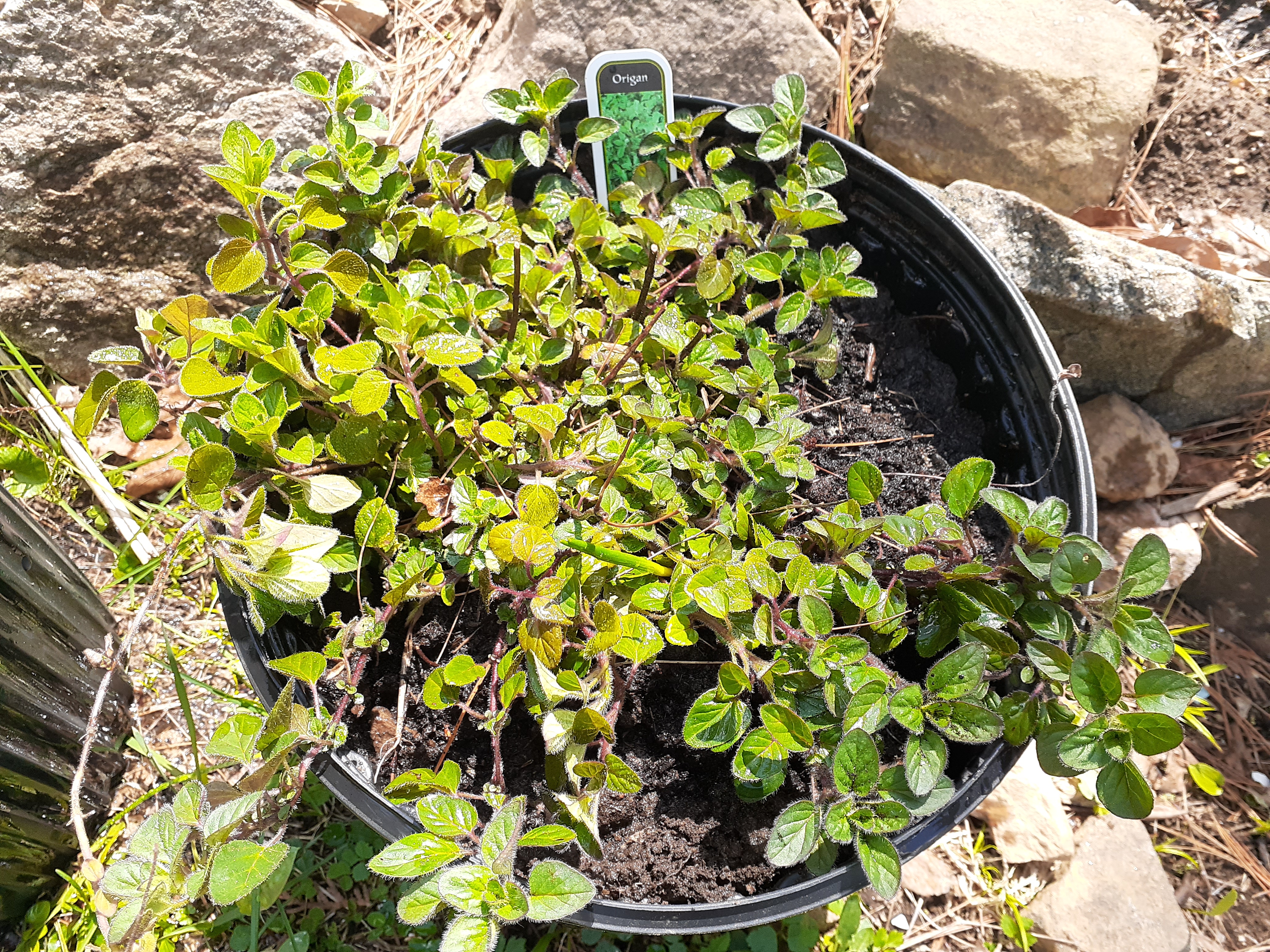 Oregano is a very vigorous plant. We knew it would come back after the freezing winter. However, you have to be careful because they are so vigorous that your garden might be taken over by them when you put it in the ground. So I potted it up to prevent it from spreading too much.