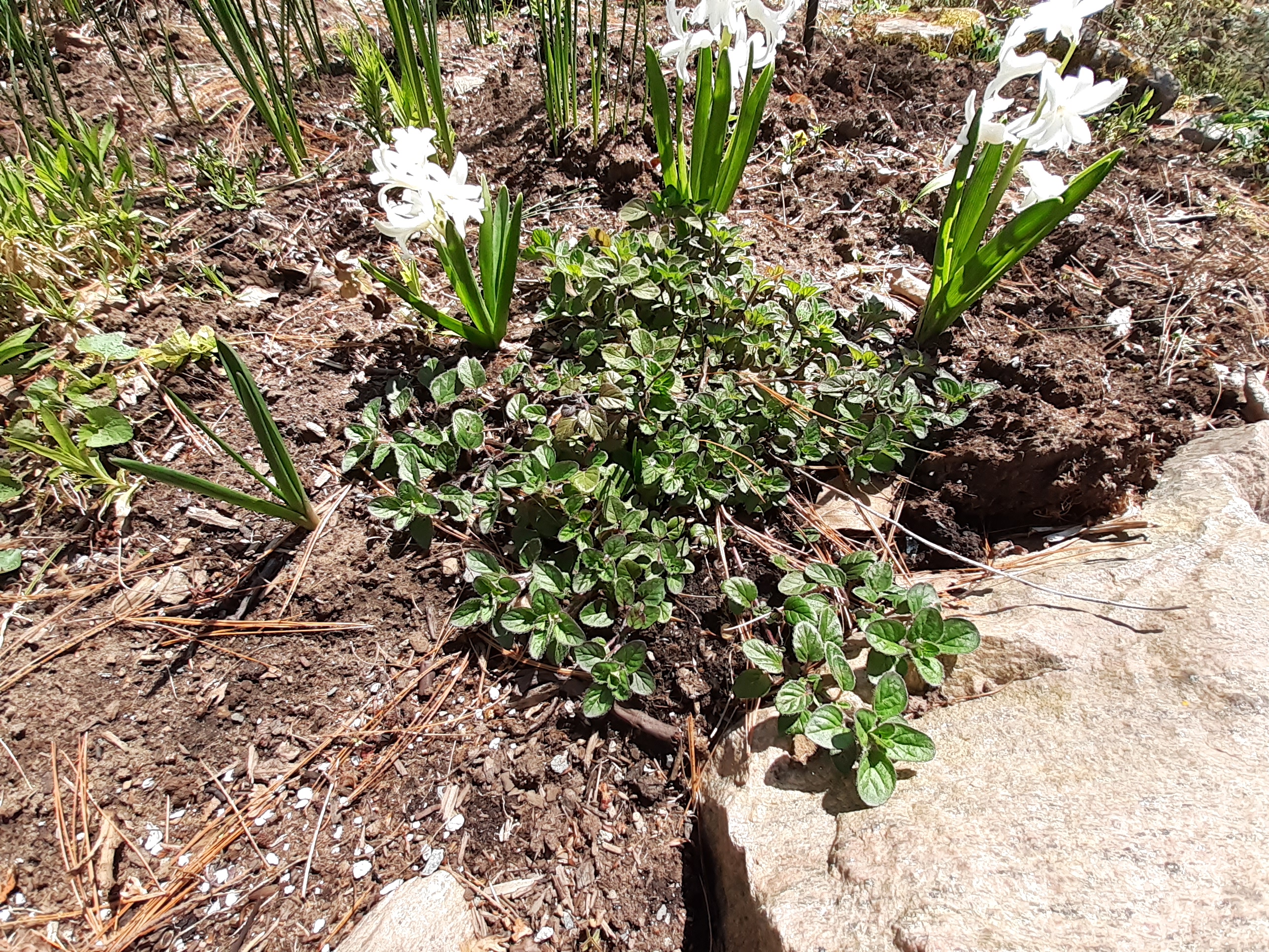 Last year we had two pots of oregano. In order to get them overwinter, we put one of them in the flowerbed at the end of autumn and brought the other one indoors. The oregano that had to stay outdoors during the winter has already been spreading. It looks very strong.