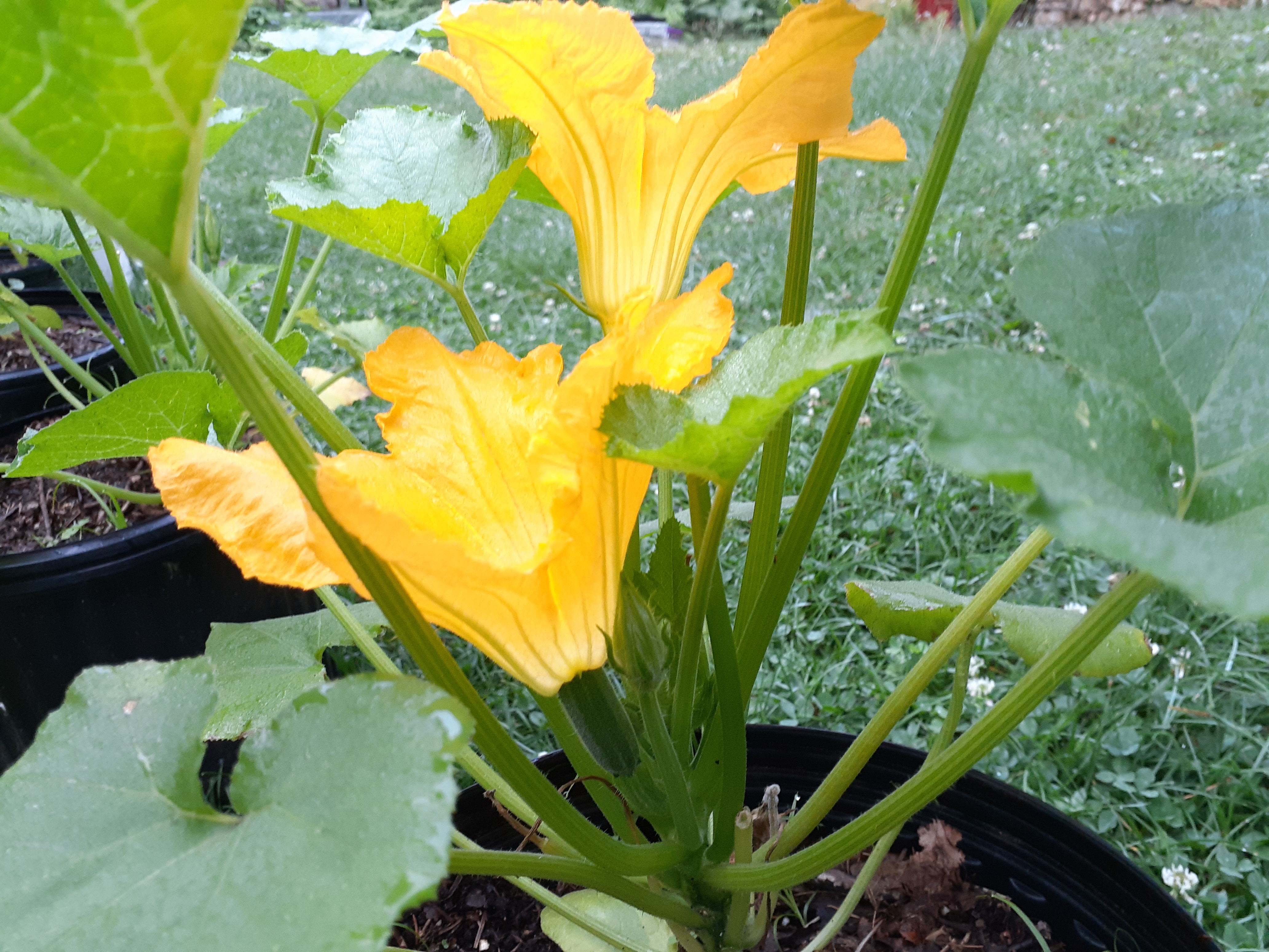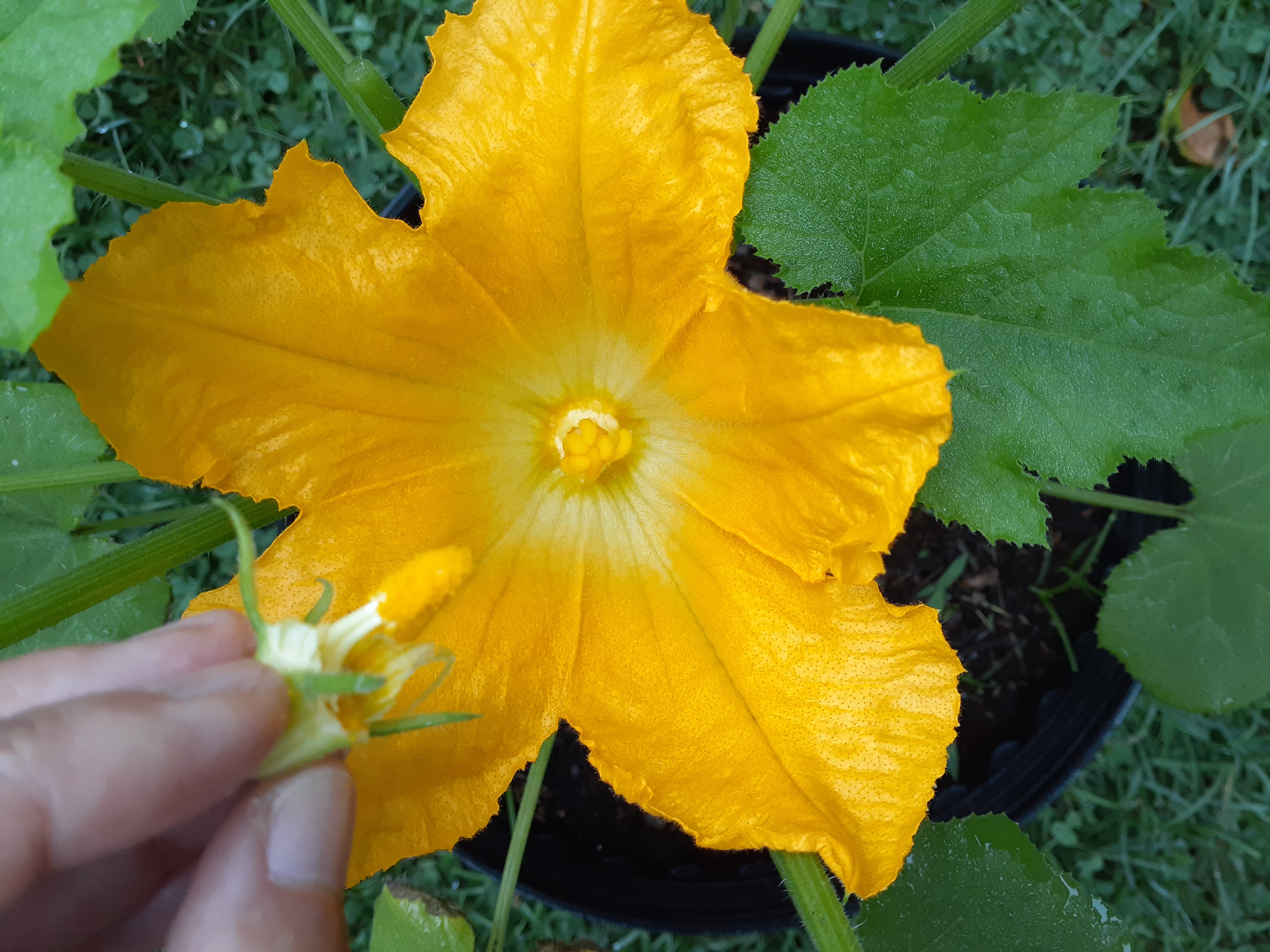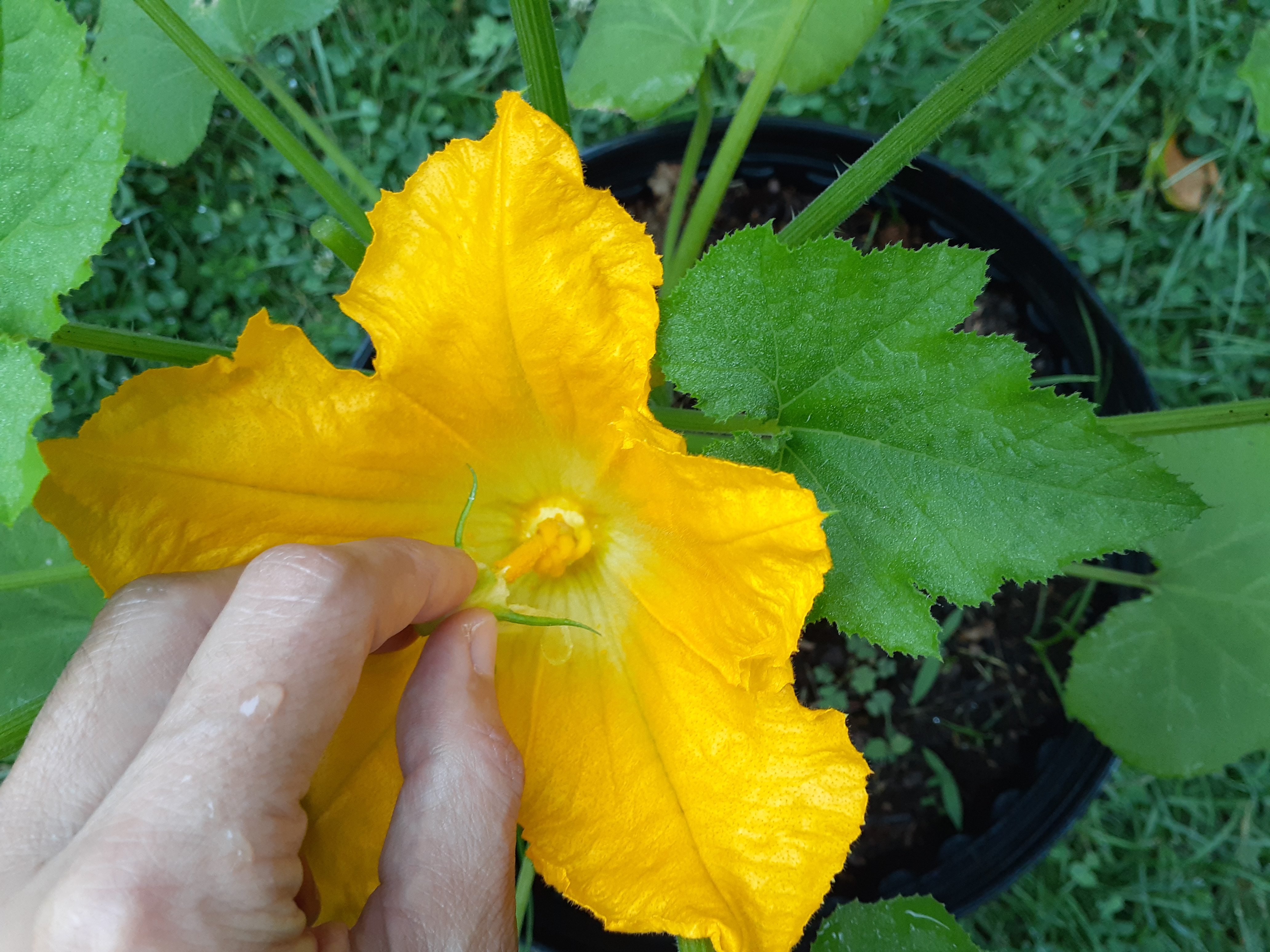 Since the courgette flowers open in the morning and close in the afternoon, pollination needs to be done in the morning. Normally they flower only one day, so we have to check them every morning to see whether there are female flowers open.